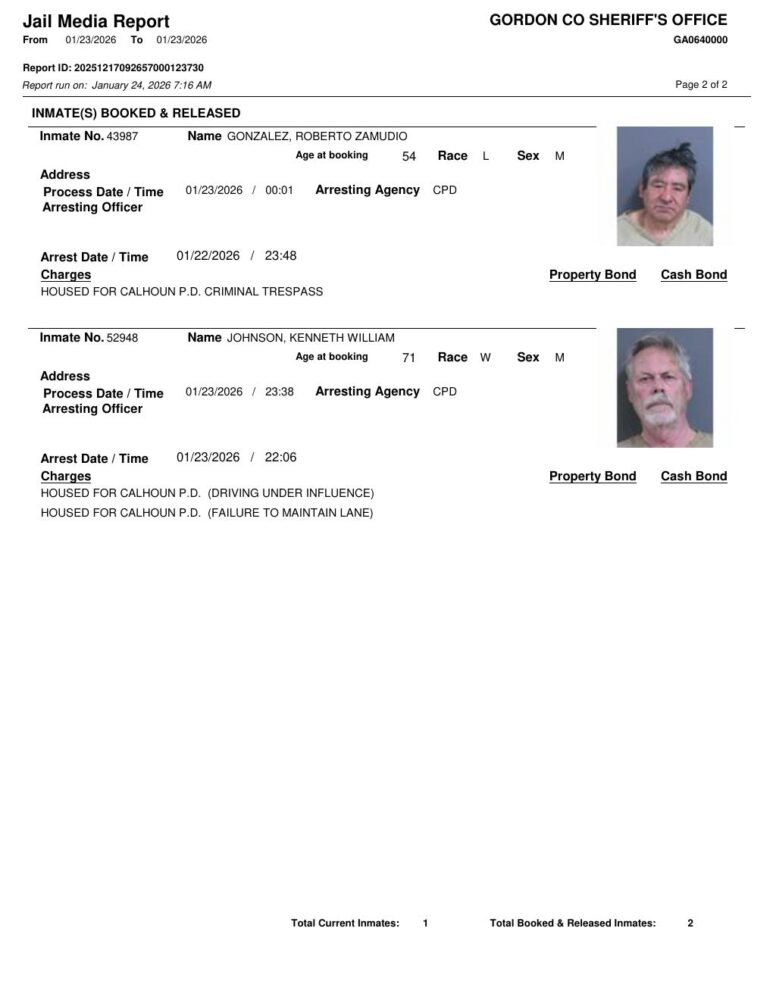 HomeArrest ReportsGordon County Arrest Report 1/24/2026Gordon County Arrest Report 1/24/2026Sat, January 24, 2026 SHARE NOW ×❮❯