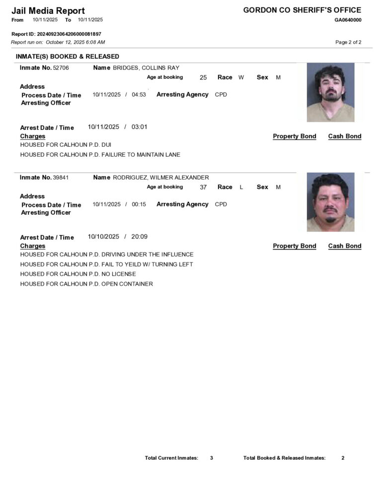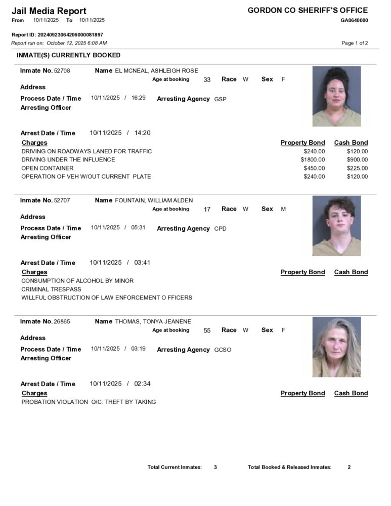 HomeArrest ReportsGordon County Arrest Report 10/12/2025Gordon County Arrest Report 10/12/2025Mon, October 13, 2025SHARE NOW ×❮❯