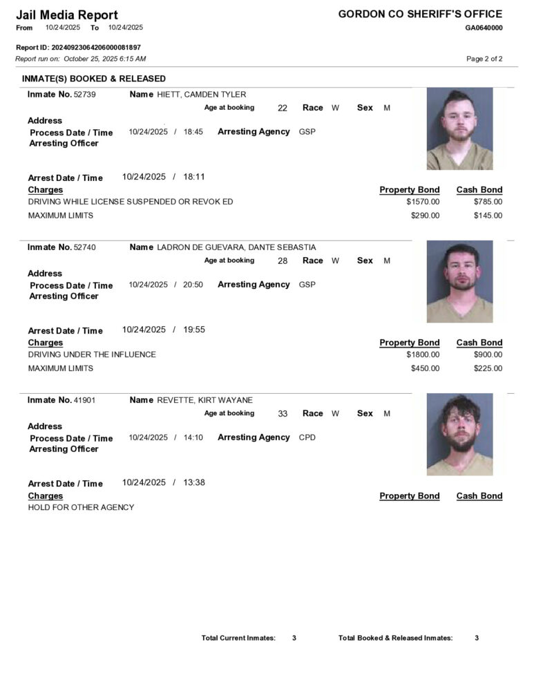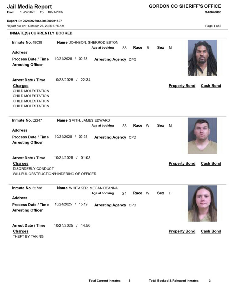 HomeArrest ReportsGordon County Arrest Report 10/25/2025Gordon County Arrest Report 10/25/2025Sat, October 25, 2025SHARE NOW ×❮❯