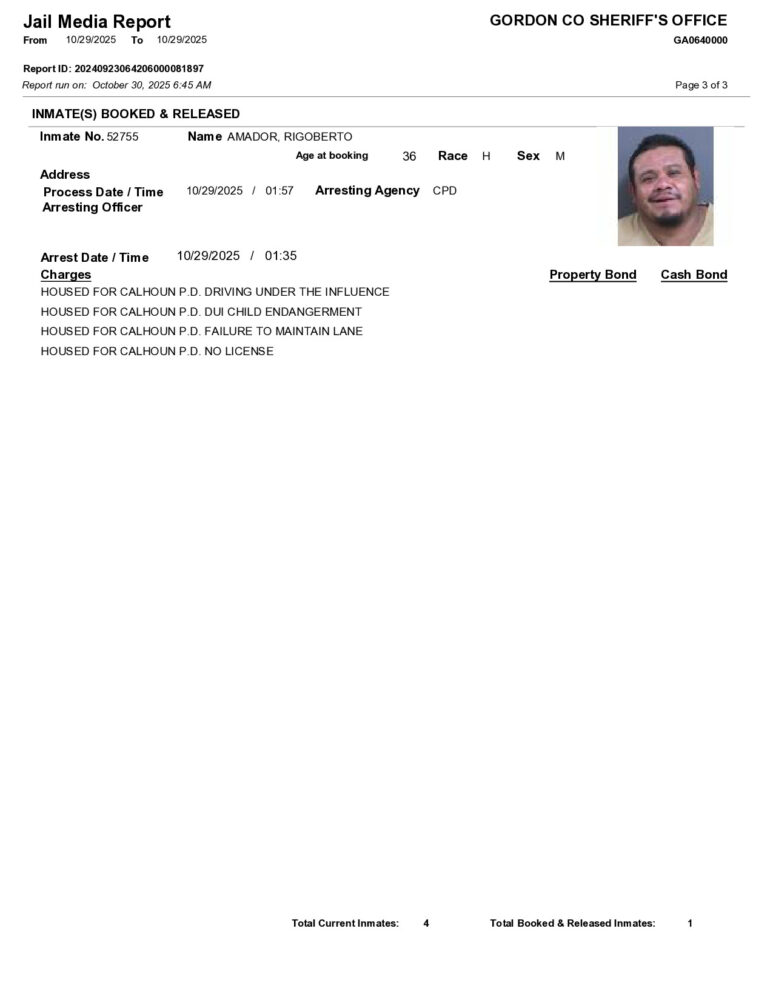 HomeArrest ReportsGordon County Arrest Report 10/30/2025Gordon County Arrest Report 10/30/2025Thu, October 30, 2025SHARE NOW ×❮❯