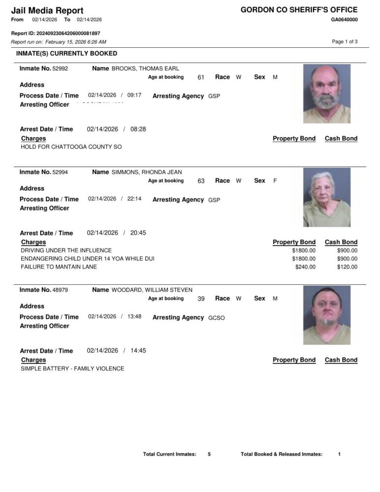 HomeArrest ReportsGordon County Arrest Report 2/15/2026Gordon County Arrest Report 2/15/2026Mon, February 16, 2026 SHARE NOW ×❮❯ Loading advertisement…