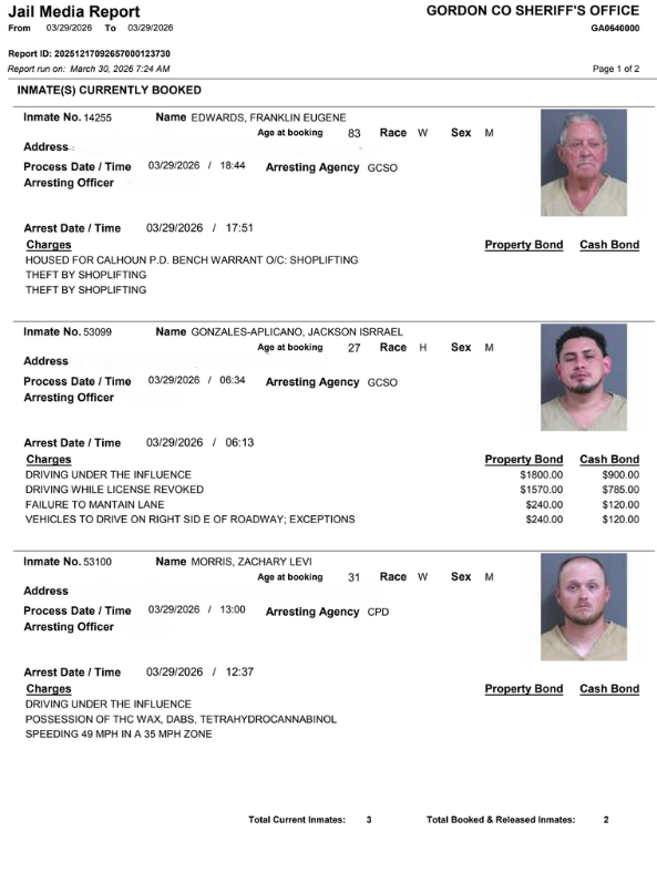Gordon County Arrest Report 3/29/2026