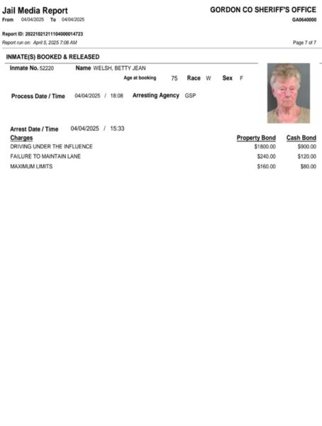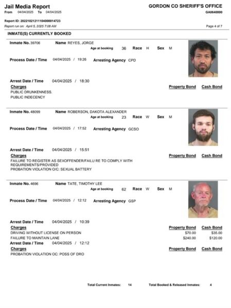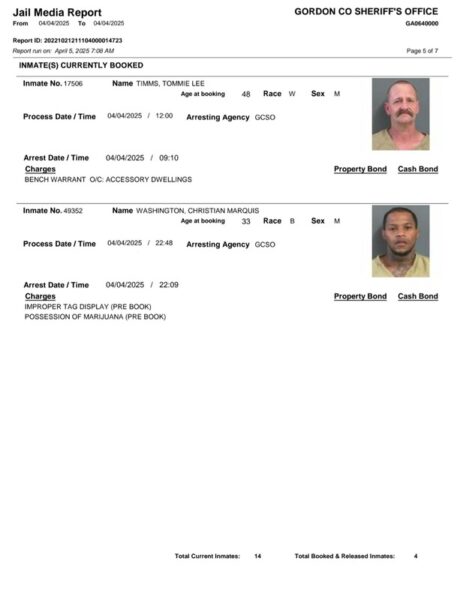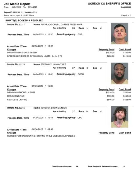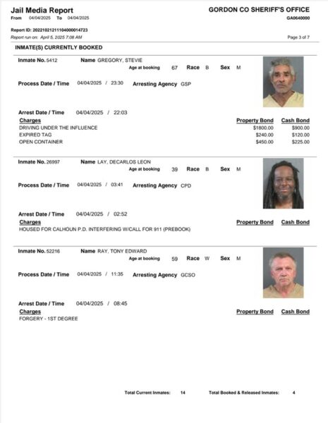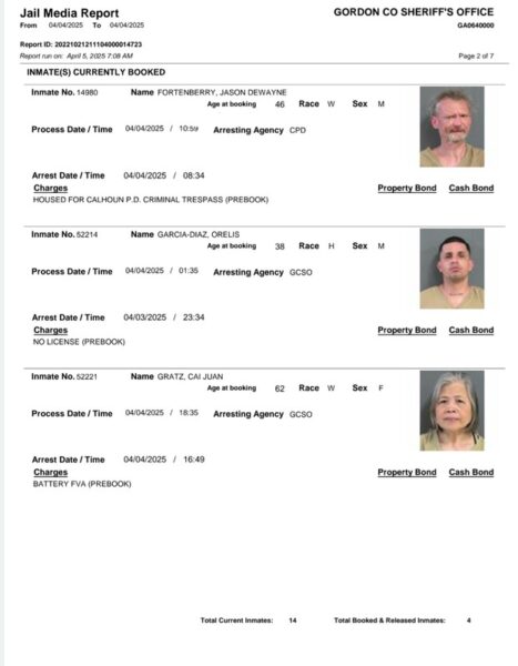 HomeArrest ReportsGordon County Arrest Report 4-05-25Gordon County Arrest Report 4-05-25Mon, April 7, 2025SHARE NOW Gordon County Sheriff’s Office released the following arrest: