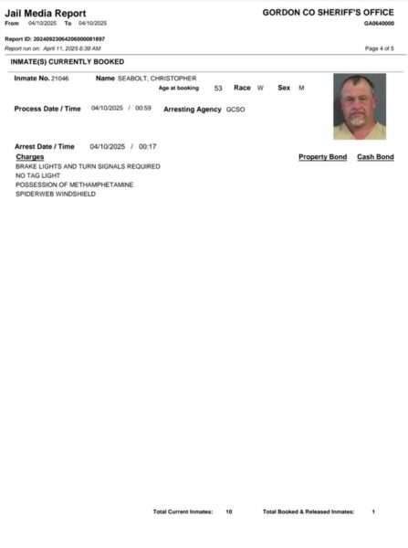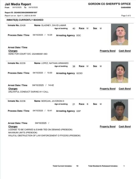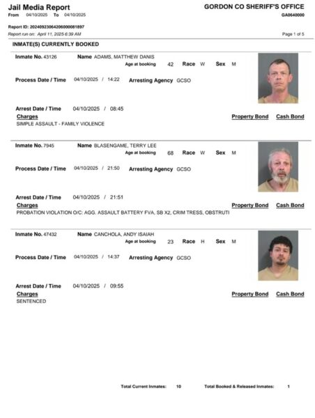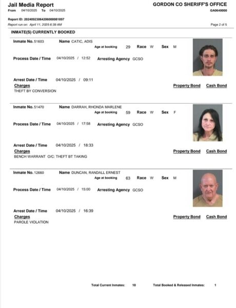 HomeArrest ReportsGordon County Arrest Report 4-11-25Gordon County Arrest Report 4-11-25Fri, April 11, 2025SHARE NOW Gordon County Sheriff’s Office released the following arrests: