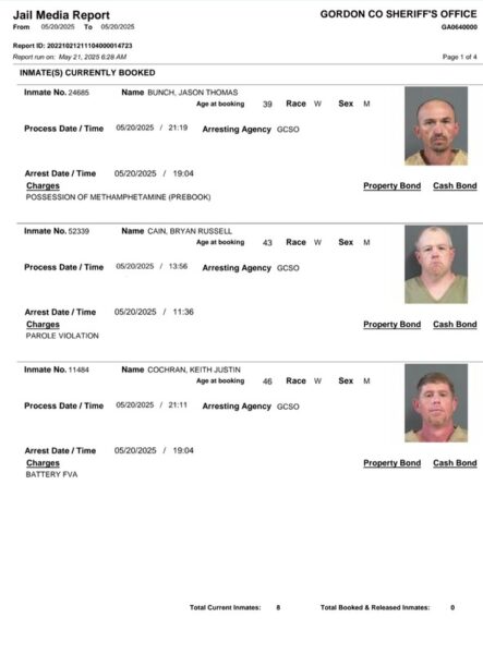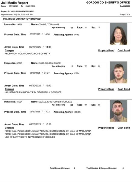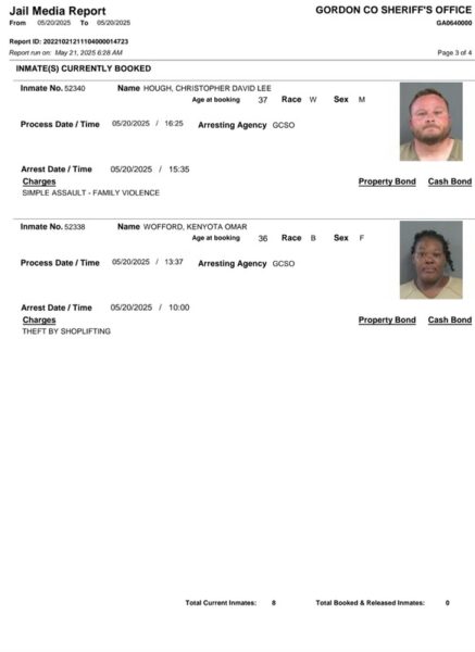 HomeArrest ReportsGordon County Arrest Report 5-21-25Gordon County Arrest Report 5-21-25Wed, May 21, 2025SHARE NOW Gordon County Sheriff’s Office released the following arrests: