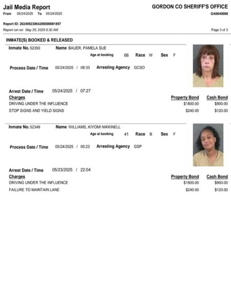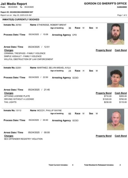 HomeArrest ReportsGordon County Arrest Report 5-25-25Gordon County Arrest Report 5-25-25Tue, May 27, 2025SHARE NOW Gordon County Sheriff’s Office released the following arrests:
