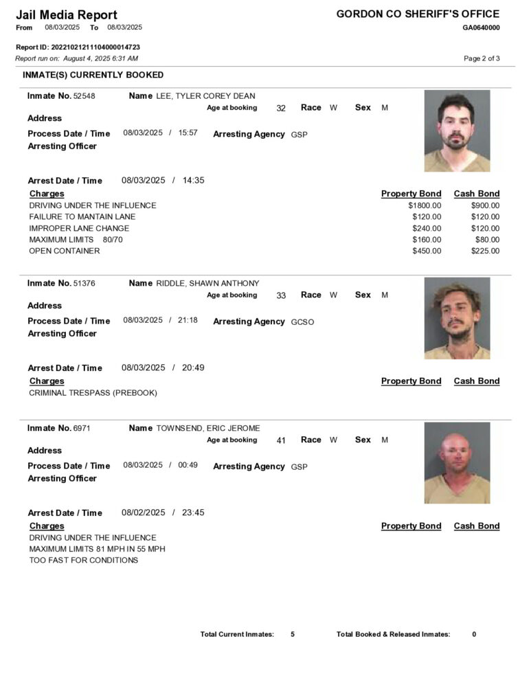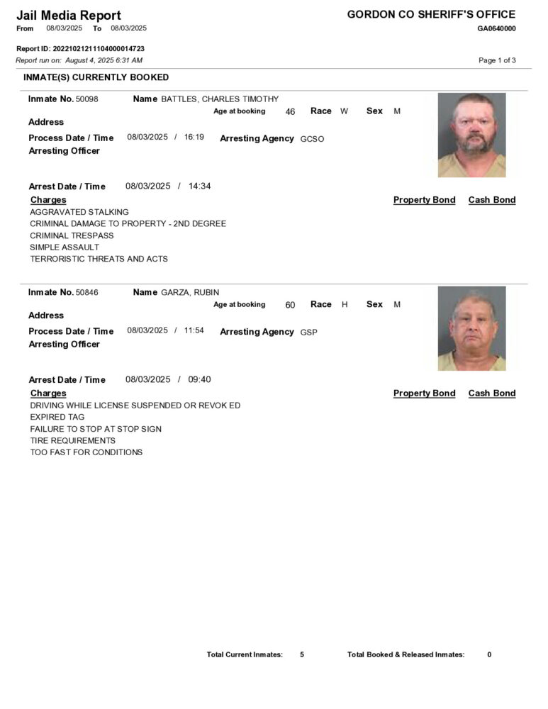 HomeArrest ReportsGordon County Arrest Report 8/4/2025Gordon County Arrest Report 8/4/2025Mon, August 4, 2025SHARE NOW ×❮❯