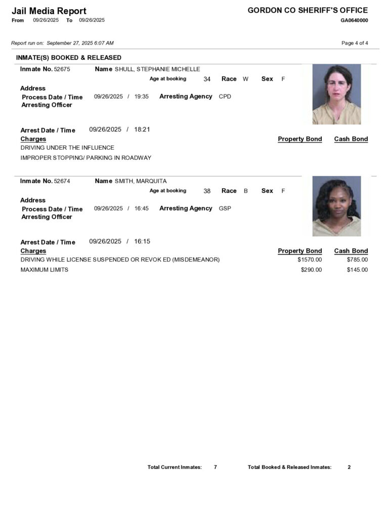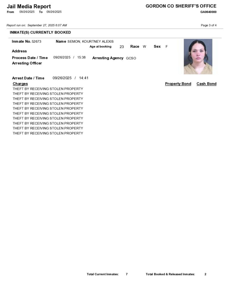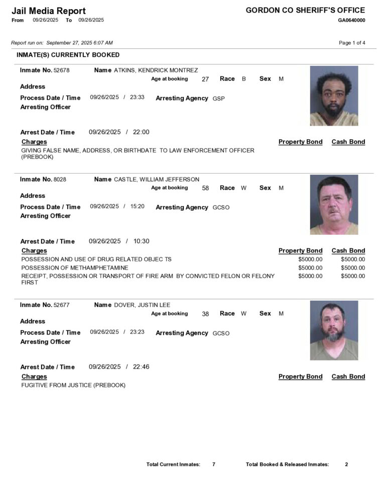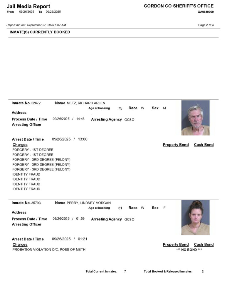 HomeArrest ReportsGordon County Arrest Report 9/27/2025Gordon County Arrest Report 9/27/2025Sat, September 27, 2025SHARE NOW ×❮❯
