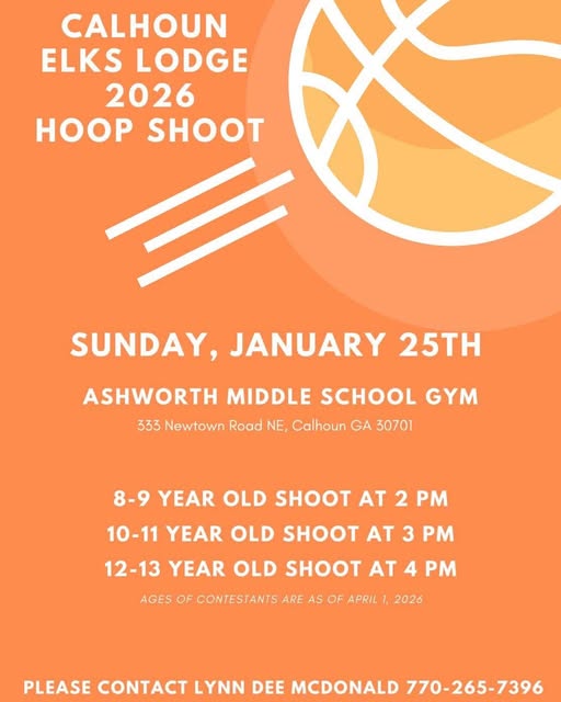 The Calhoun Elks Lodge will host its annual 2026 Hoop Shoot competition on Sunday, Jan. 26, at the Ashworth Middle School Gym, located at 333 Newtown Road NE in Calhoun. The event is open to the public.