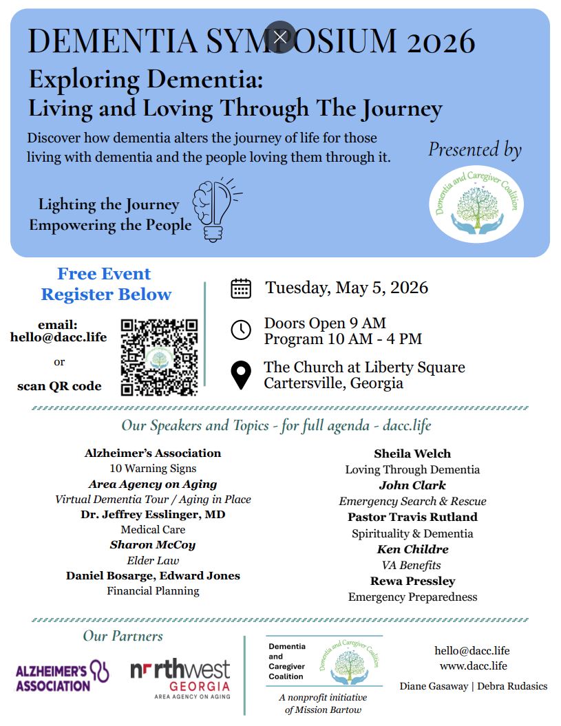 The event is presented by the Dementia and Caregiver Coalition, a nonprofit initiative of Mission Bartow, in partnership with the Alzheimer’s Association and the Northwest Georgia Area Agency on Aging.