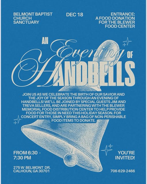The community is warmly invited to An Evening of Handbells on Thursday, Dec. 18, from 6:30–7:30 p.m. in the sanctuary of Belmont Baptist Church, located at 275 West Belmont Drive in Calhoun.