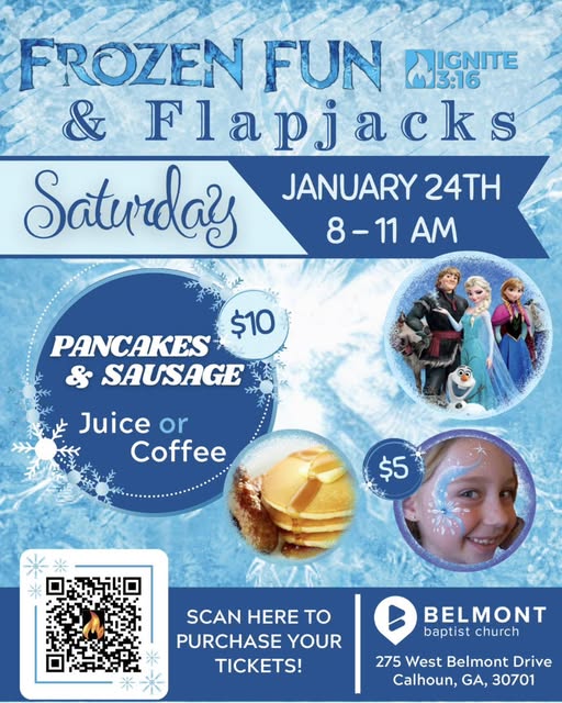 Ignite 3:16 will host its Frozen Fun & Flapjacks fundraiser on Saturday, Jan. 24, from 8 to 11 a.m. at Belmont Baptist Church, located at 275 West Belmont Drive in Calhoun.