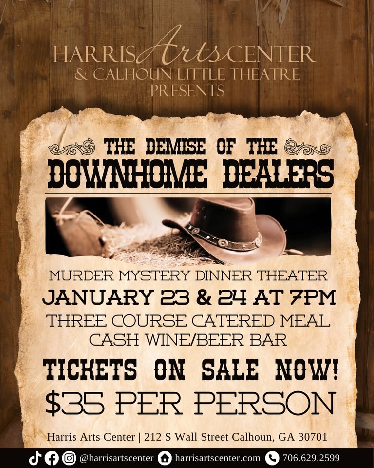 The Calhoun Little Theatre and Harris Arts Center are thrilled to announce their annual murder mystery dinner theater event, “The Demise of the Downhome Dealers,” coming to the stage on January 23 and 24 at 7:00 p.m.