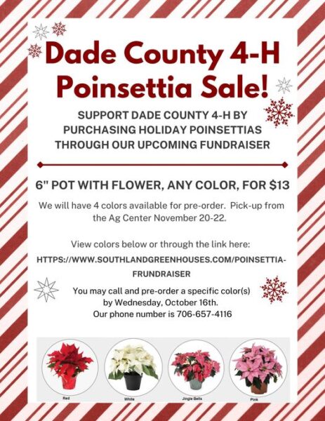 The Dade County 4-H will be selling poinsettias again this year by pre-order only. They will be $13 each and pre-orders are due by Wednesday, October 16th. Contact them at 706.657.4116 if you would like to order.