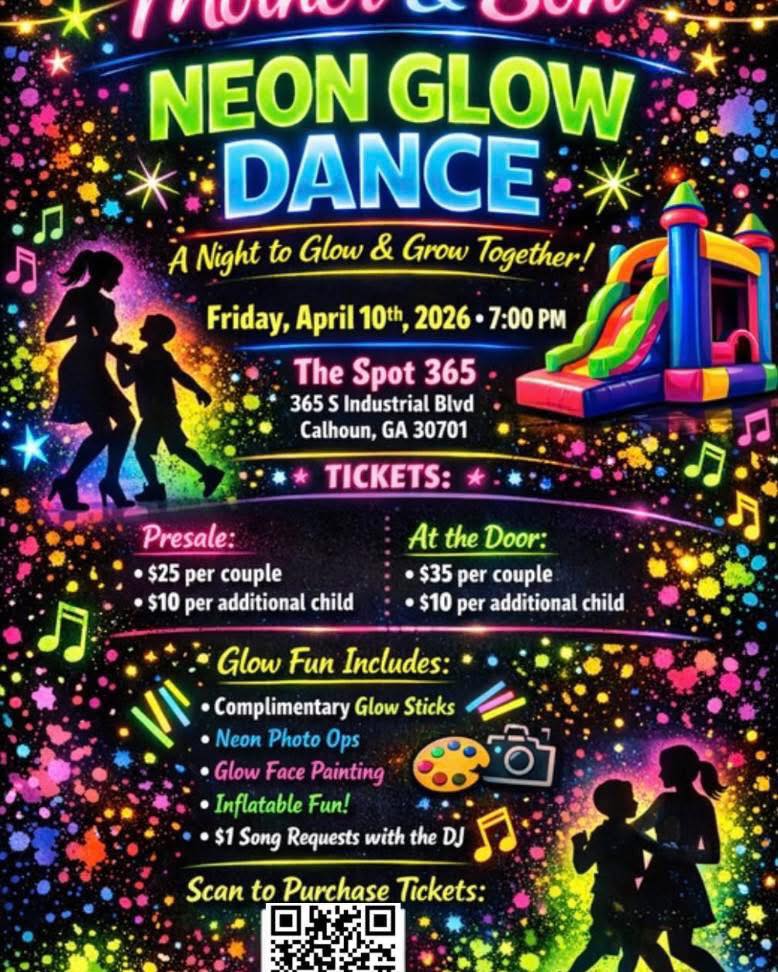 Get ready for a night of glowing fun and unforgettable memories! Moms and their sons are invited to light up the dance floor at the Mother & Son Neon Glow Dance this Friday, April 10th at The Spot 365 in Calhoun.