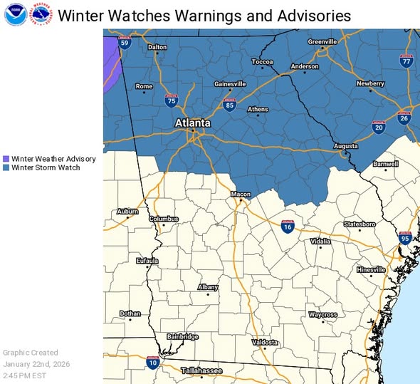 A major winter storm is still expected to bring significant impacts to North Georgia, including Metro Atlanta, this weekend. The Winter Storm Watch has been expanded southward to include all counties north of I-20, the entire Metro Atlanta area, and several counties north and east of Macon.