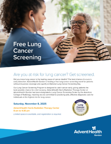 Calhoun, GA — AdventHealth Gordon will host a free lung cancer screening event on National Lung Cancer Screening Day, Saturday, Nov. 8, from 8 a.m. to 4:30 p.m. at the AdventHealth Harris Radiation Therapy Center.