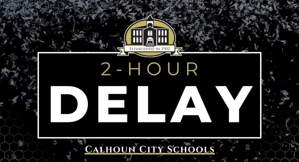 Calhoun City Schools will operate on a two-hour delay on Monday, March 16, 2026, due to a severe weather system expected to move through the area overnight and into the early morning hours.