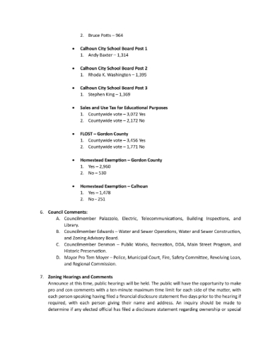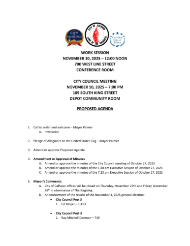 The City of Calhoun has announced that its elected officials will convene for both a work session and a regular City Council meeting on Monday, November 10, 2025.
