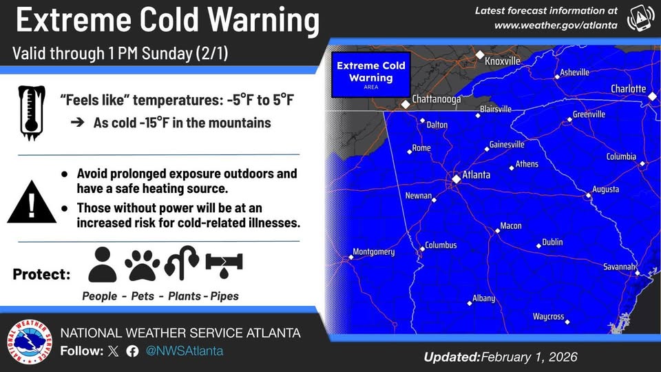 Dangerously cold temperatures and wind chills are affecting much of north and central Georgia today, according to the National Weather Service.