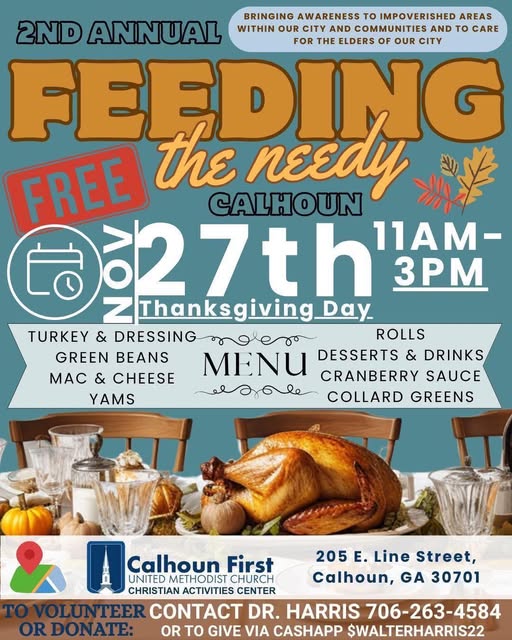 Calhoun’s 2nd annual Feeding the Needy Thanksgiving event will take place on Thursday, Nov. 27, 2025, from 11 a.m. to 3 p.m. at the Christian Activities Center of Calhoun First United Methodist Church, 205 East Line Street. This free event welcomes not only those in financial need but anyone seeking fellowship and friendship during the holiday season.