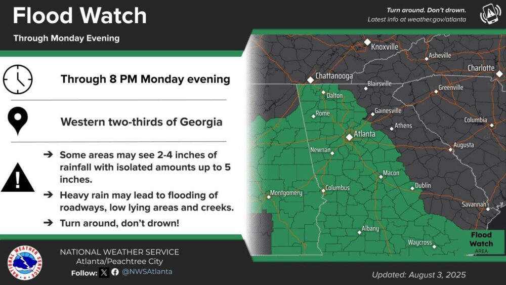 A Flood Watch is currently in effect for Gordon County and much of the surrounding region. The western two-thirds of the area are expected to receive between 2 to 4 inches of rainfall through Monday evening, with isolated areas potentially seeing even higher totals.