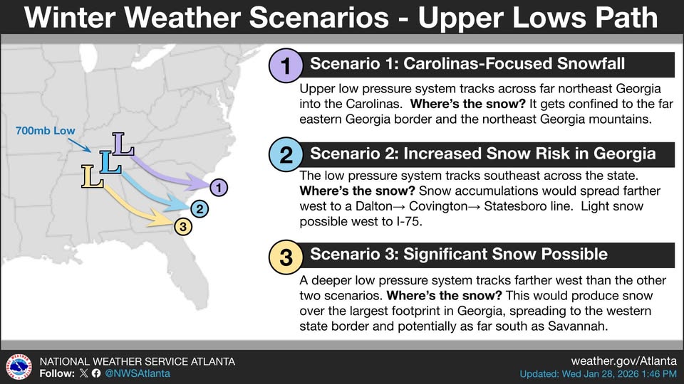 Forecasters noted that while a similar weather graphic was shared earlier, updated information highlights how subtle changes in the storm’s track could significantly alter where snow ultimately falls. Current model projections show that any of the potential tracks would likely bring snow to northeast and eastern Georgia.