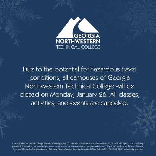 Georgia Northwestern Technical College (GNTC) has announced that all campuses will be closed on Monday, January 26, due to the potential for hazardous travel conditions.