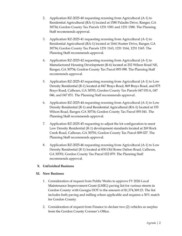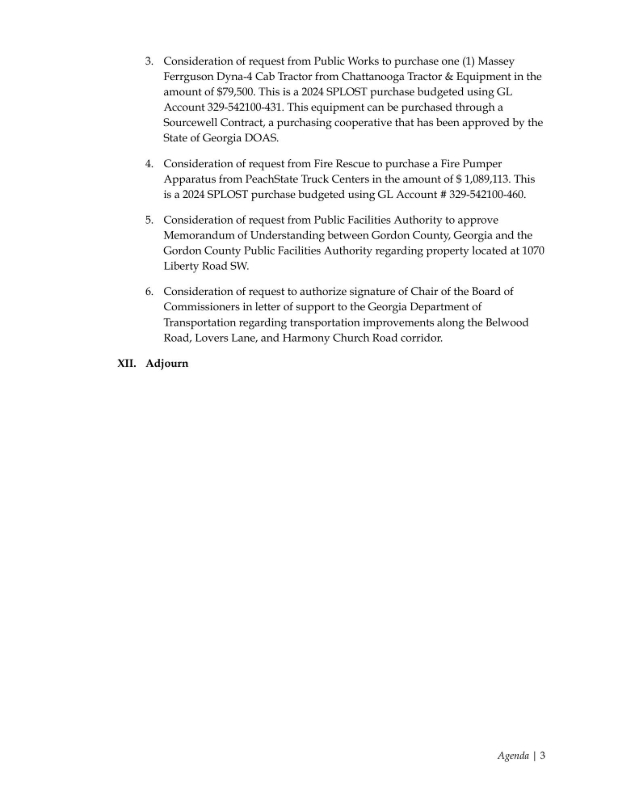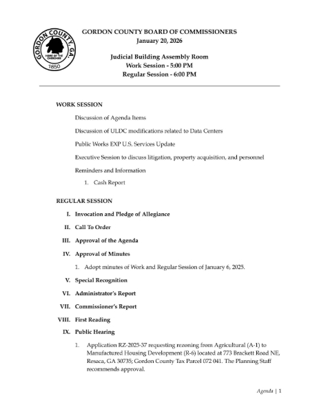Agendas for the meeting are available to the public and can be viewed below or online by visiting the Gordon County Agenda Center at https://gordoncountyga.gov/agendacenter.
