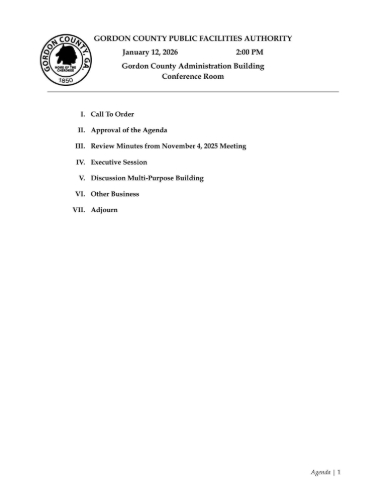The Gordon County Board of Commissioners will hold a scheduled Public Facilities Authority meeting on Monday, January 12, 2026, at 2:00 PM. The meeting will take place in the Conference Room of the Gordon County Administration Building, located at 201 N. Wall Street, Calhoun, Georgia 30701.