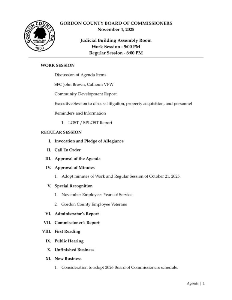 The Gordon County Board of Commissioners will hold its regular meeting on Tuesday, November 4, 2025, in the Judicial Building Assembly Room. A work session will begin at 5 p.m., followed by the regular session at 6 p.m.
