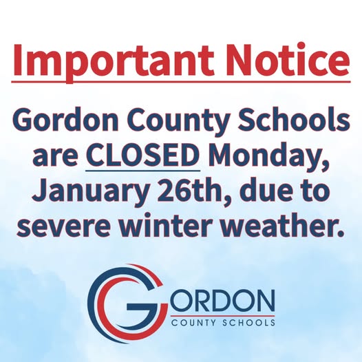 Gordon County Schools announced today that all schools will be closed on Monday, January 26, 2026, in response to the latest weather forecast from the Georgia Emergency Management and Homeland Security Agency (GEMA), which indicates the potential for severe winter weather in northwest Georgia.
