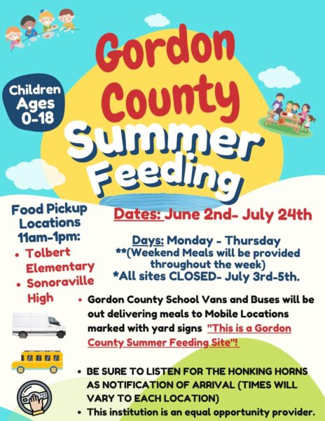 Summer Feeding is starting SOON! Look for Gordon County School buses or vans in your neighborhood (listen for the horns!), or come to Tolbert Elementary or Sonoraville High School to pick up meals. They will be serving breakfasts and lunches Monday through Thursday from 11:00 a.m. to 1:00 p.m. Meal service will be identical to last year: same meal service, same routes, same times.