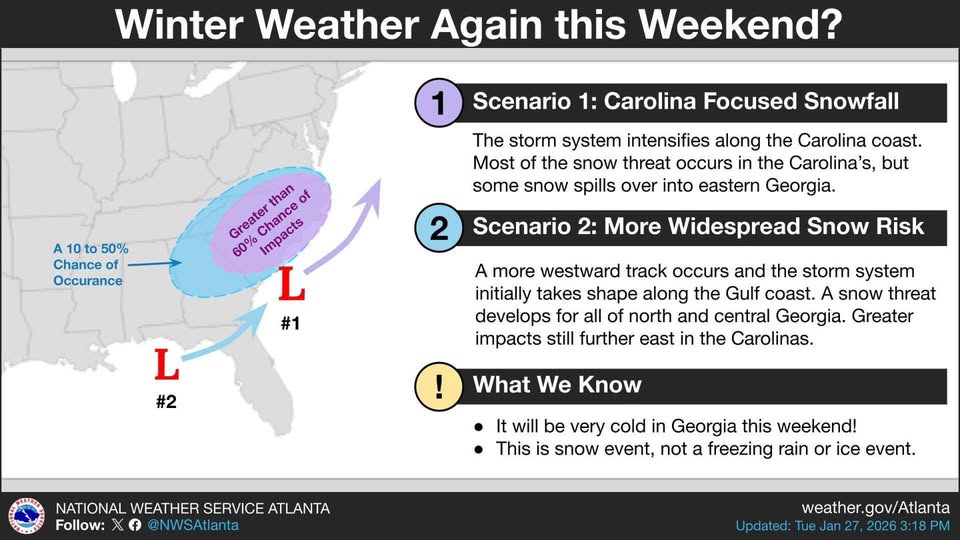 While widespread snowfall is not currently expected across Georgia, temperatures will remain cold, and residents—particularly in northern and eastern parts of the state—are encouraged to monitor forecasts as conditions develop.