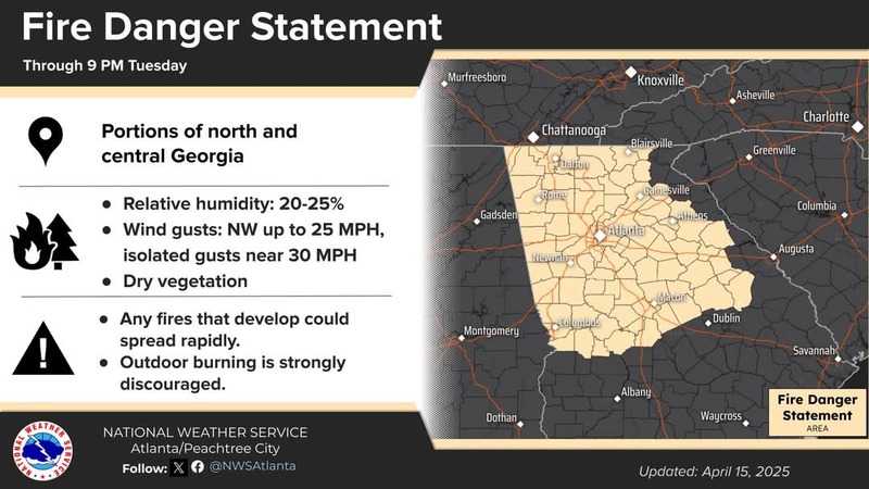 HomeLocalNWS: Fire Danger StatementNWS: Fire Danger StatementTue, April 15, 2025SHARE NOW Low relative humidity and gusty winds mean fires that develop could spread rapidly.Outdoor burning is strongly discouraged today.