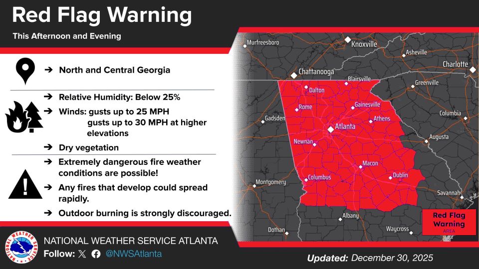 A Red Flag Warning will be in effect for Gordon County and other parts of Georgia today from noon until 7 p.m., as weather conditions create a heightened risk for wildfires.