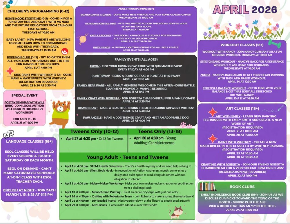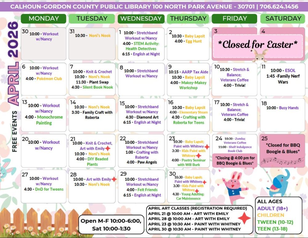 The Calhoun-Gordon County Public Library is blooming with activity this April, offering a full calendar of free programs for all ages.