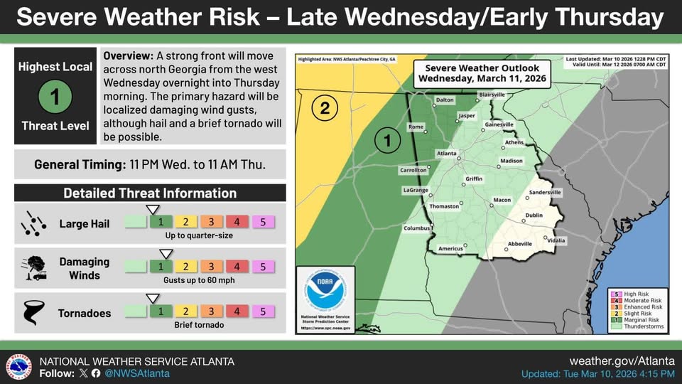 The National Weather Service is advising residents across north and central Georgia to prepare for the possibility of strong to severe storms Wednesday night into Thursday as a cold front moves through the region.