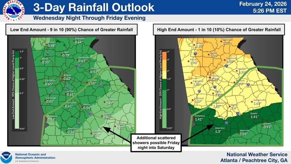 The National Weather Service is advising residents to prepare for a period of showers and thunderstorms moving through the area beginning Wednesday night and continuing through Friday evening. In east-central Georgia, rain chances could linger into early Saturday morning.